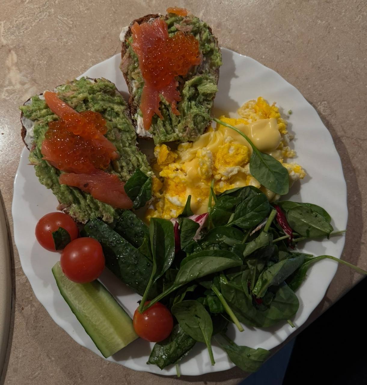 Тости з авокадо, слабосоленою сьомгою,смаженим яйцем, помідорами, огірками та листям шпинату