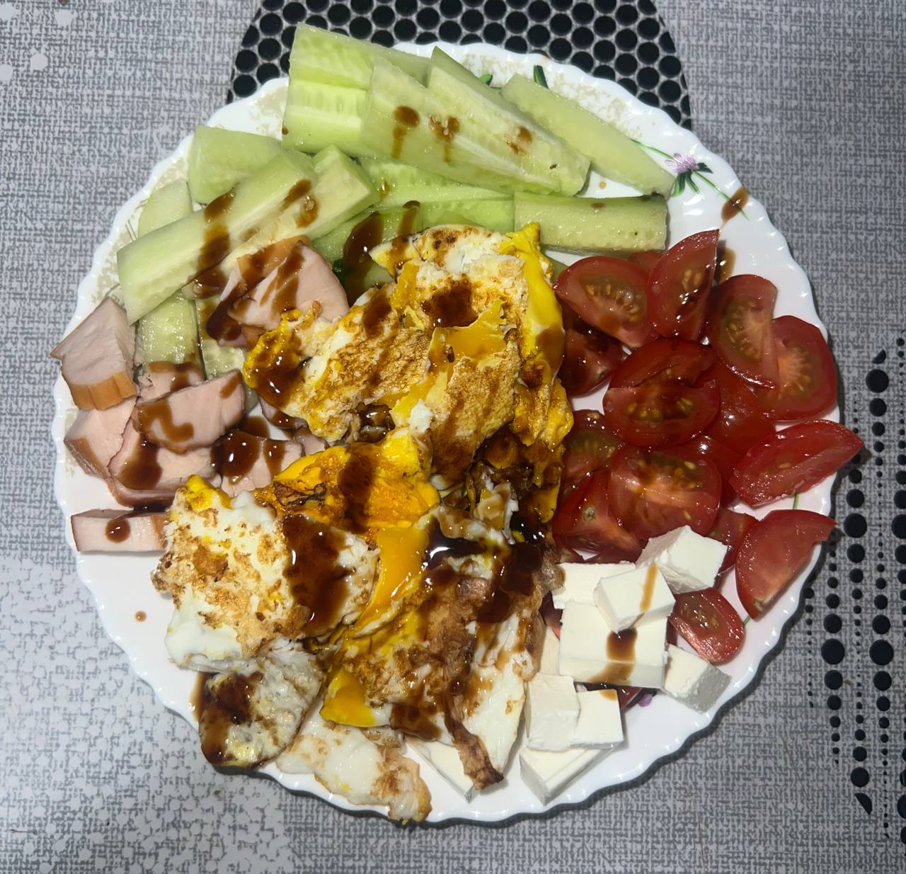 Огірки, помідори, яйце смажене без олії, копчено-варене куряче філе та сир фета